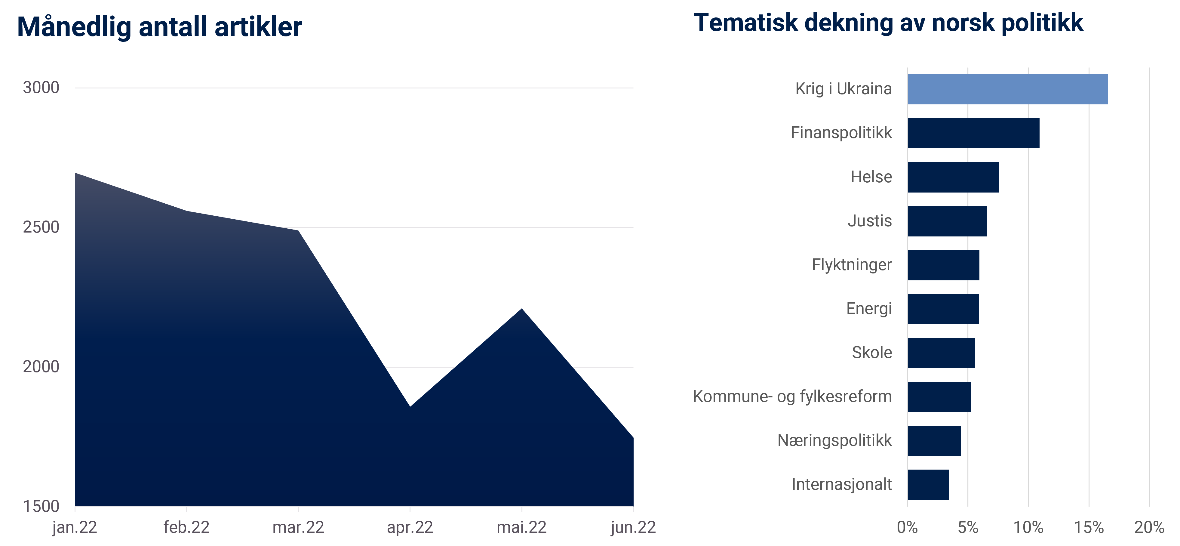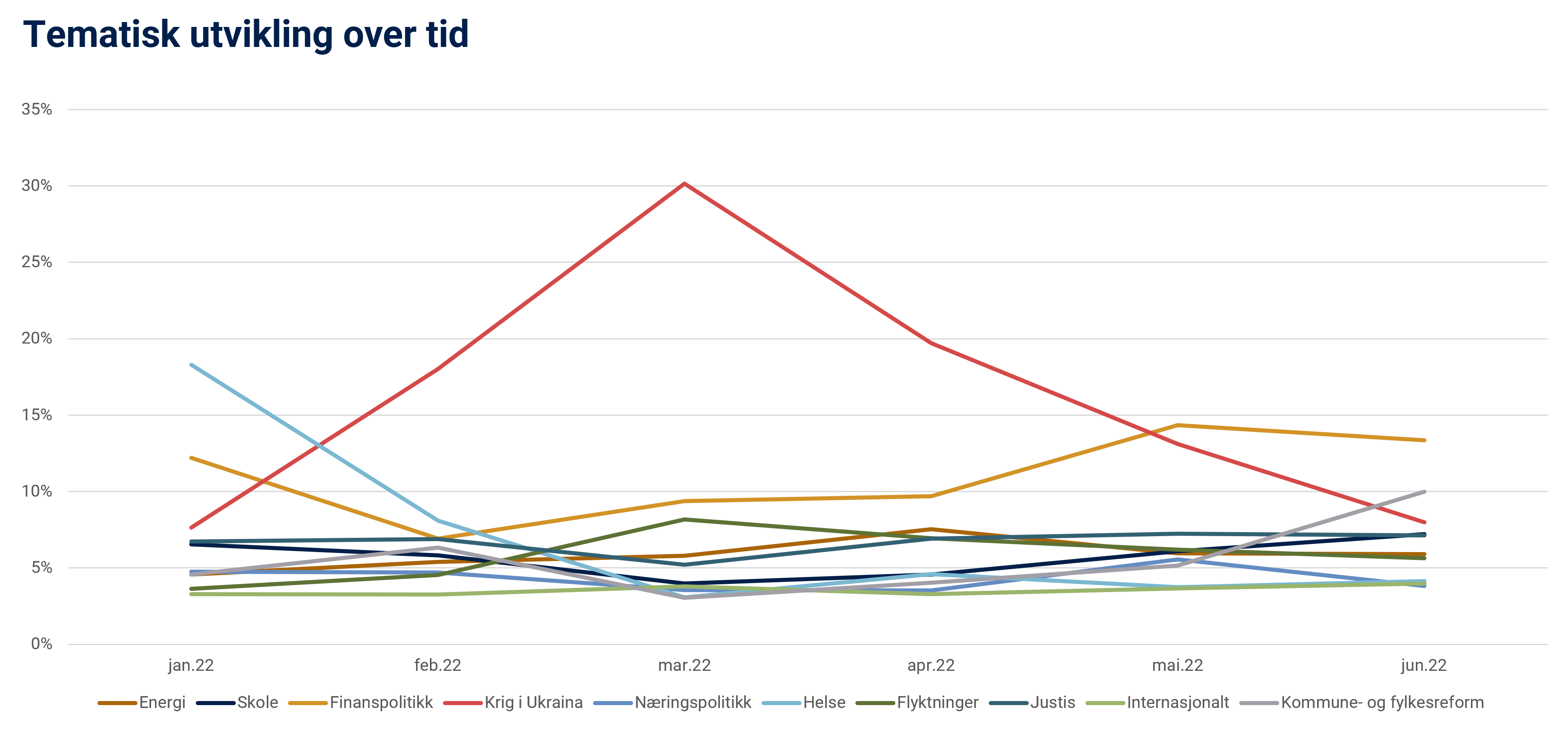 Krigen i Ukraina var som nevnt, det mest omtalte temaet i første halvår av 2022. Vi finner allerede i februar at dette var det mest omtalte temaet i norske riksmedier, og det holdt seg slik fram til mai. Trykket var høyest i mars, med en andel på over 30 % av alle oppslag om politikk i Norge. Allerede i april falt omtalemengden kraftig, og i juni var vi nede på bare 8 %.