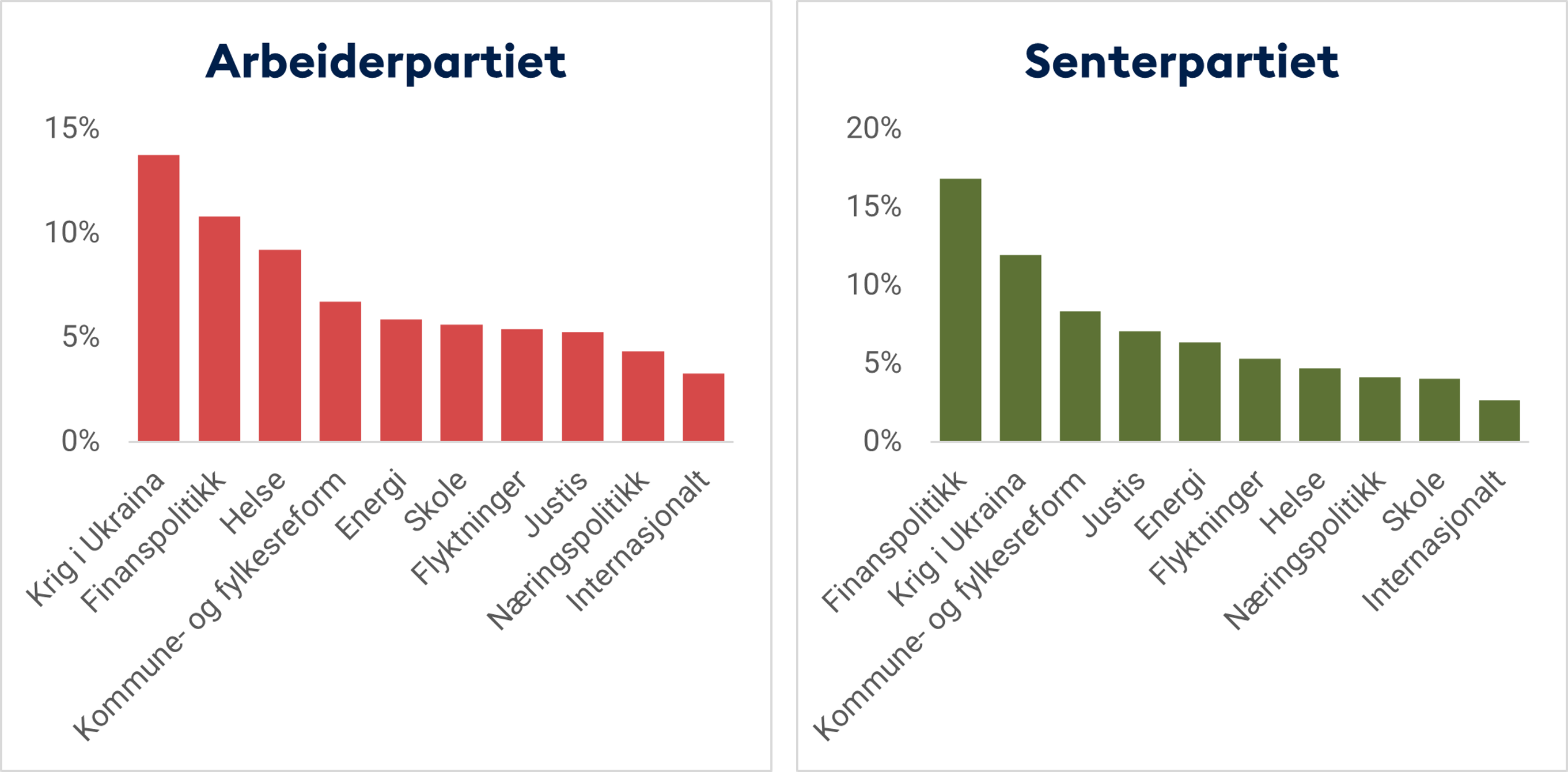 Krigen i Ukraina og finanspolitikk er de mest omtalte temaene, både hos Arbeiderpartiet og Senterpartiet. Men graden er ulik; Mens krigen er det mest omtalte temaet tilknyttet Arbeiderpartiet, er det for Senterpartiet finanspolitikk som topper.