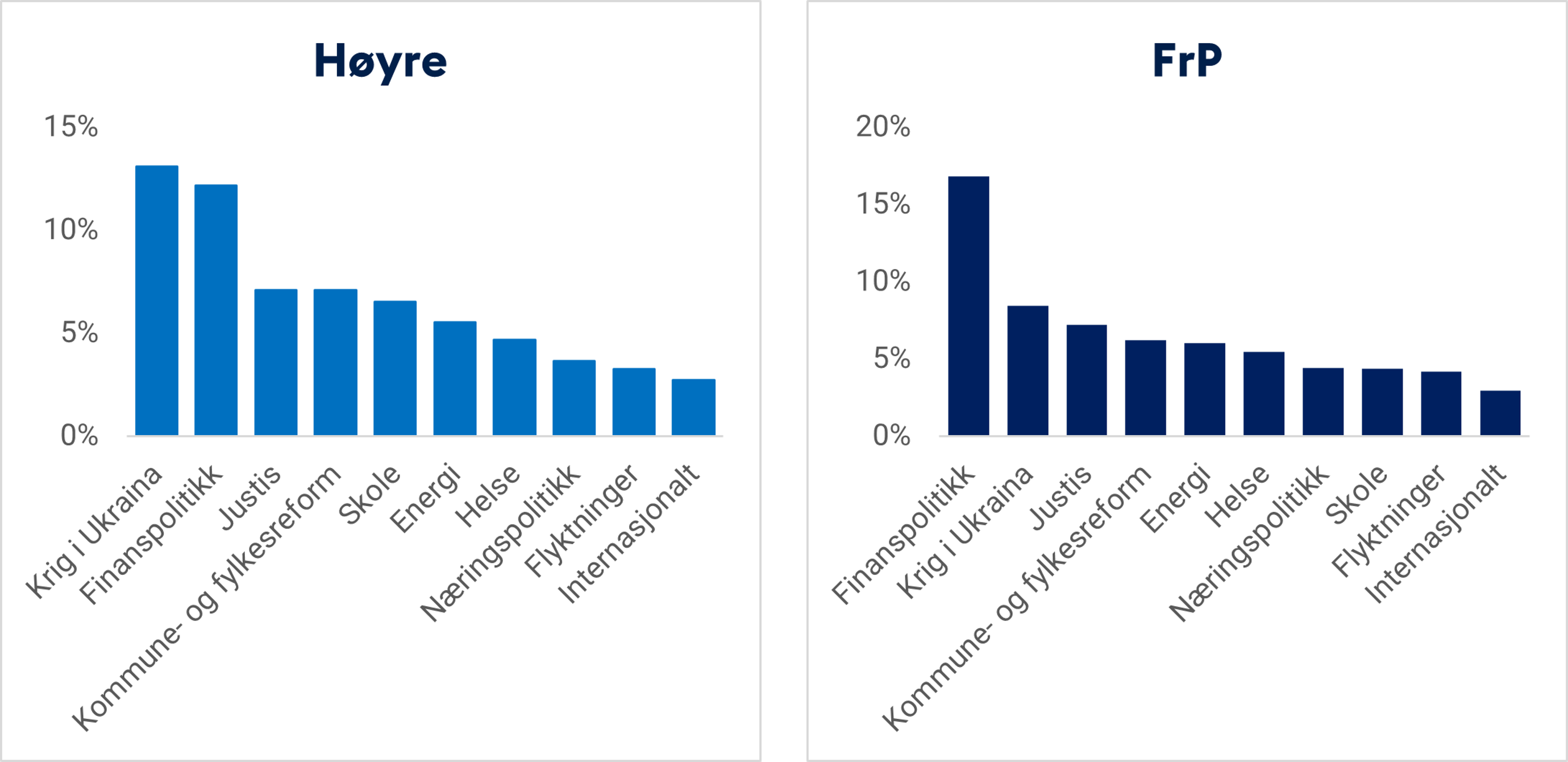 En sammenligning av de to største opposisjonspartiene, Høyre og FrP, viser at førstnevnte får noe mer omtale enn sistnevnte. Høyre, i likhet med Arbeiderpartiet, har blitt omtalt mest i forbindelse med krigen i Ukraina. Mens FrP, i likhet med Senterpartiet, er omtalt mest i forbindelse med finanspolitikk. Begge partiene har blitt omtalt mye i forbindelse med justispolitikk og kommune- og fylkesreformen, mens Høyre markerer seg tydeligere innen skolepolitikk.