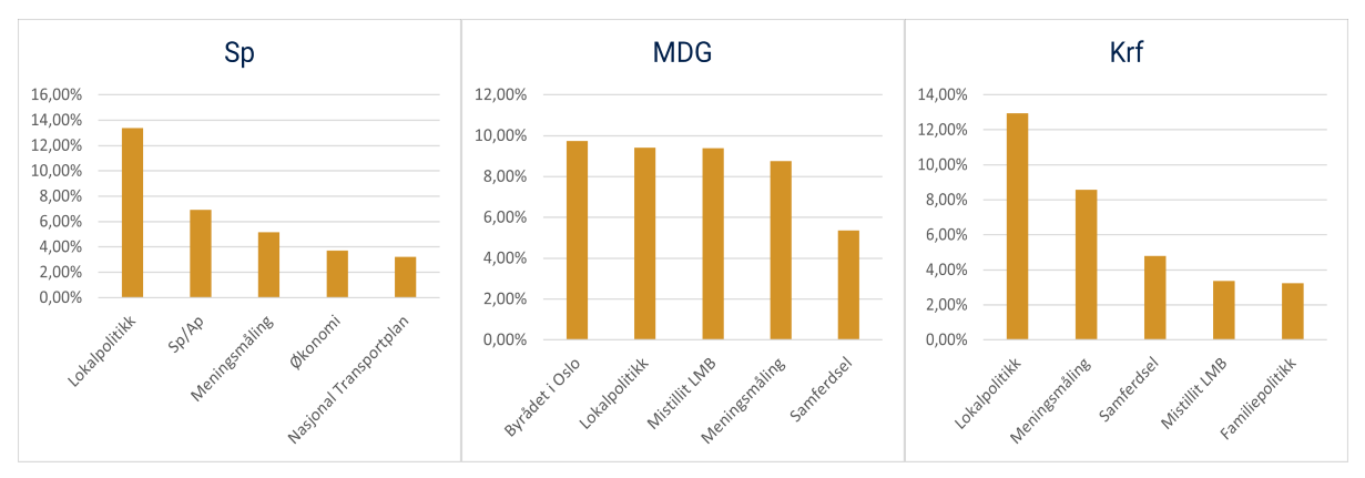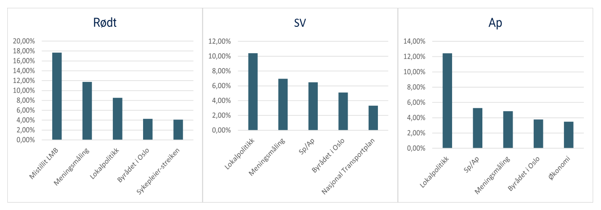 Videre finner vi at både omtale av Ap og Sp i forbindelse med Slagsvold Vedums kandidatur som statsminister, og mistilliten mot Lan Marie Berg og Oslo-byrådets påfølgende avgang fikk mye omtale i juni. Figurene under viser hvilke fem temaer stortingspartiene er omtalt mest i forbindelse med, i måneden som gikk.