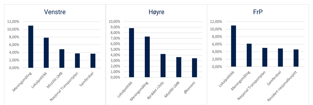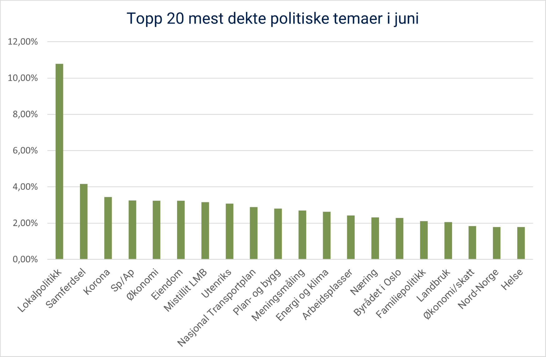 Tabellene over viser et klart bilde av at det er byrådet i Oslo og mistilliten mot Lan Marie Berg som har vært høyest på agendaen hos de fleste partiene i juni. Videre finner vi at de fleste partiene i størst grad er omtalt i forbindelse med meningsmålinger.