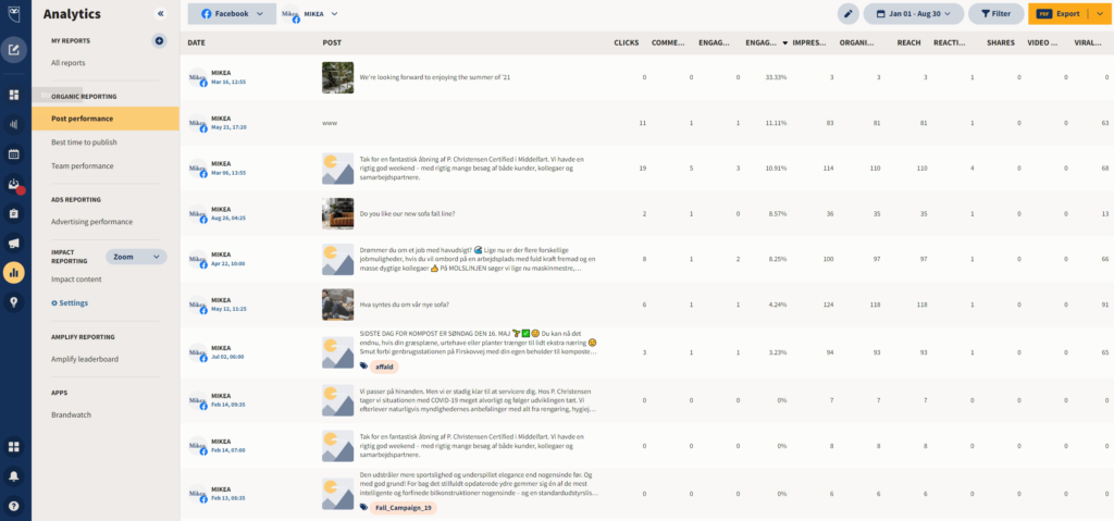 Under Organic reporting finner du en oversikt over det organiske innholdet ditt på tvers av kanalene du har lagt til i Hootsuite. Som du kjenner det fra ’Quick views’, kan du se de forskjellige KPIene dine på hvert enkelt innhold.