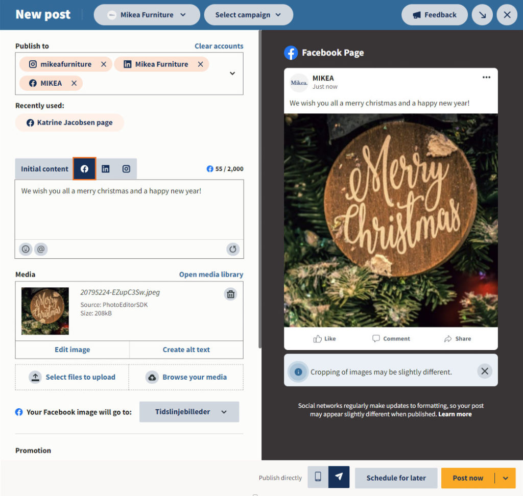 Nå er det enklere for deg å lage innhold på tvers av sosiale mediekanaler samtidig. Med noen få klikk kan du lage innhold til både Facebook, Instagram, Twitter og LinkedIn – hvor hvert innlegg er tilpasset det enkelte mediet.