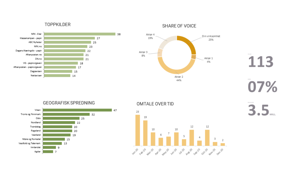 Gir et raskt overblikk over all relevant medieomtale, målt i antall artikler, rekkevidde, toppkilder osv.