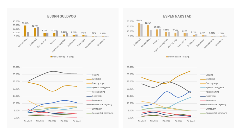 En sammenligning av talspersoner og/eller virksomheter der mengden omtaler knyttet til ulike temaer blir tallfestet og visualisert.