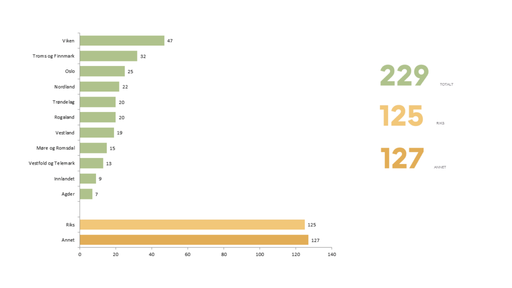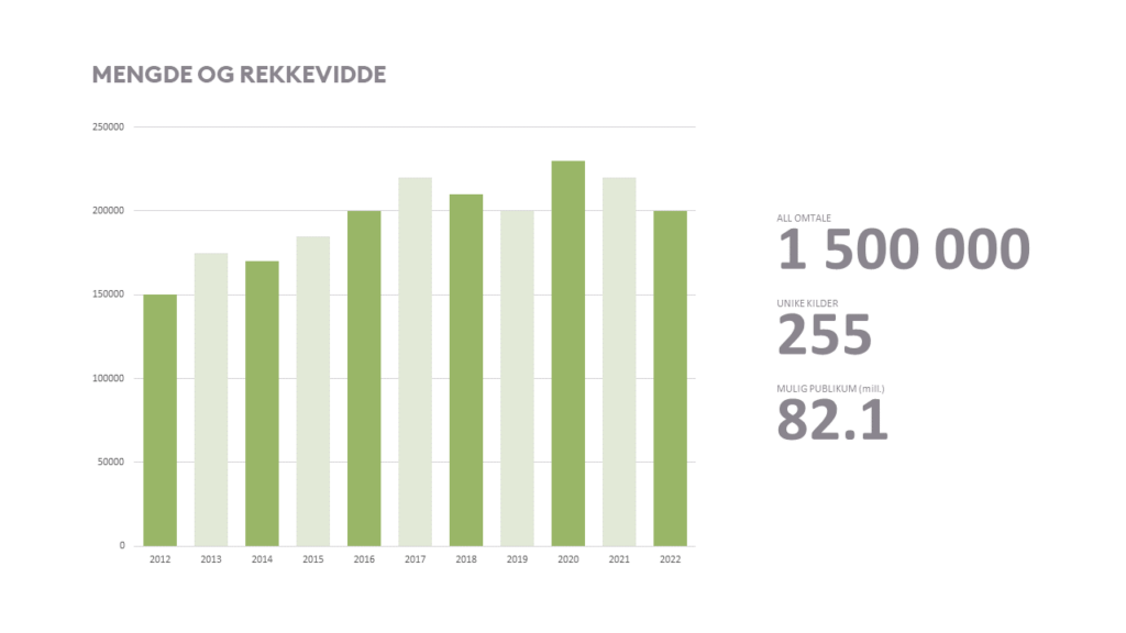 Detaljert oversikt over medieomtale fordelt på geografiske områder (lokalt, nasjonalt og globalt), over en lenger tidsperiode.