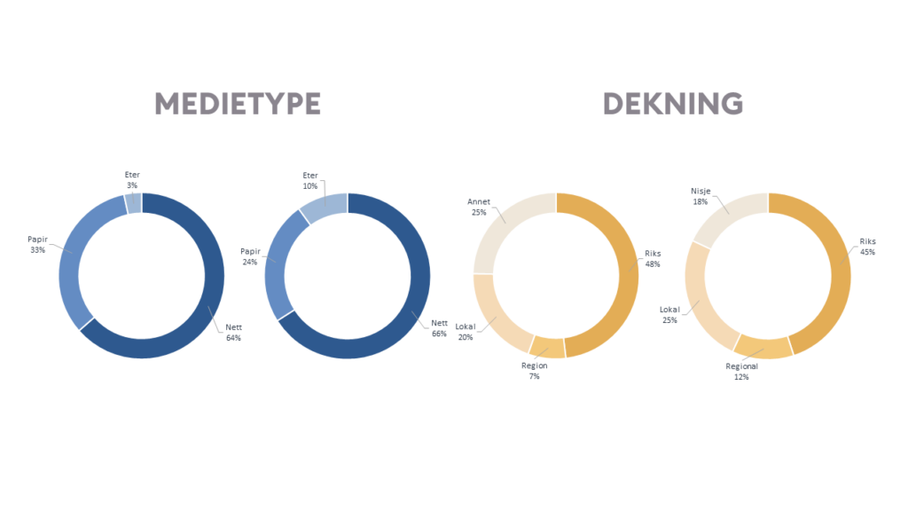 Viser hvilke kildekategorier medieomtalen har fortonet seg i, fordelt på type medie (papir, nett, eter) og dekning (lokalt, regionalt, riks, nisje osv.).