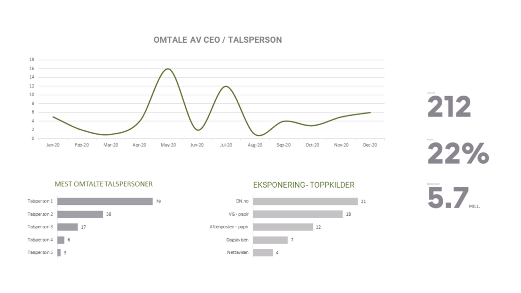 Gir innblikk i hvordan enkeltpersoner (f.eks. CEO, kommunikasjonssjef og øvrige talspersoner) har nådd gjennom i mediene.