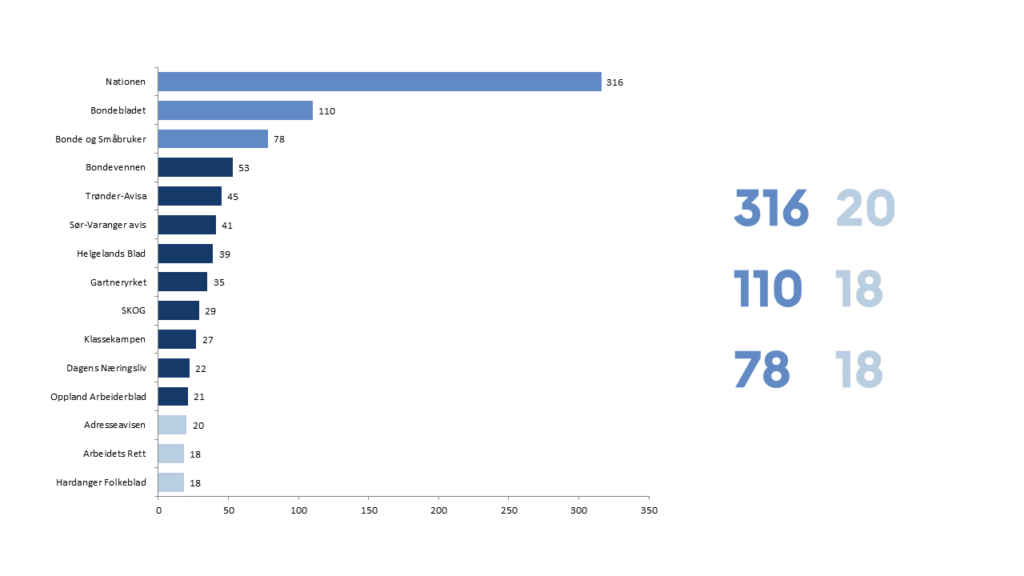 Dokumenterer hvilke redaksjoner som har publisert flest artikler om overordnet (eller hvert enkelt) tema, på tvers av medietyper og geografi.